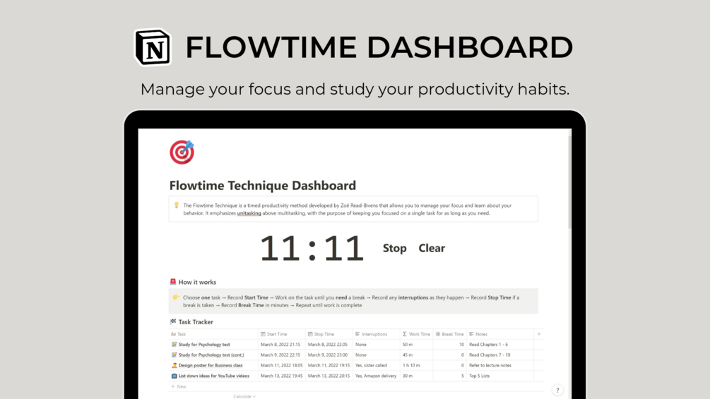 Stay focused and enter into a state of “flow” with this simple Flowtime Technique Dashboard, designed to let you be completely focused and immersed in your work.
